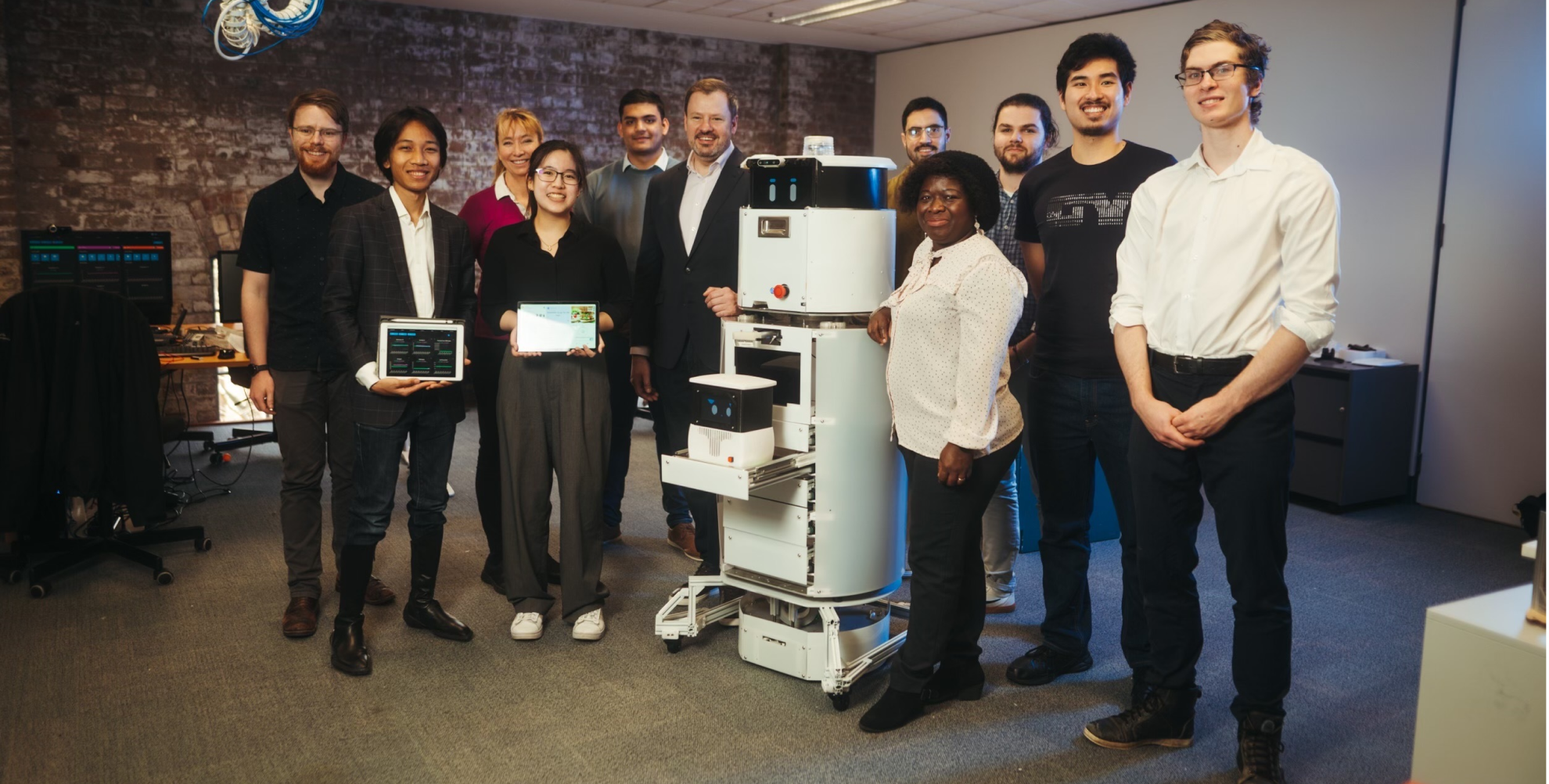 When we asked our prototype, Murphy, to 'wake up' from sleep mode he told a joke which was met with amusement from the Minister and laughter from the team. Later during the demonstration, the robot's ability to switch from conversational to task-focused states was showcased as Murphy picked up small objects and communicated with his robot partner, Zero.